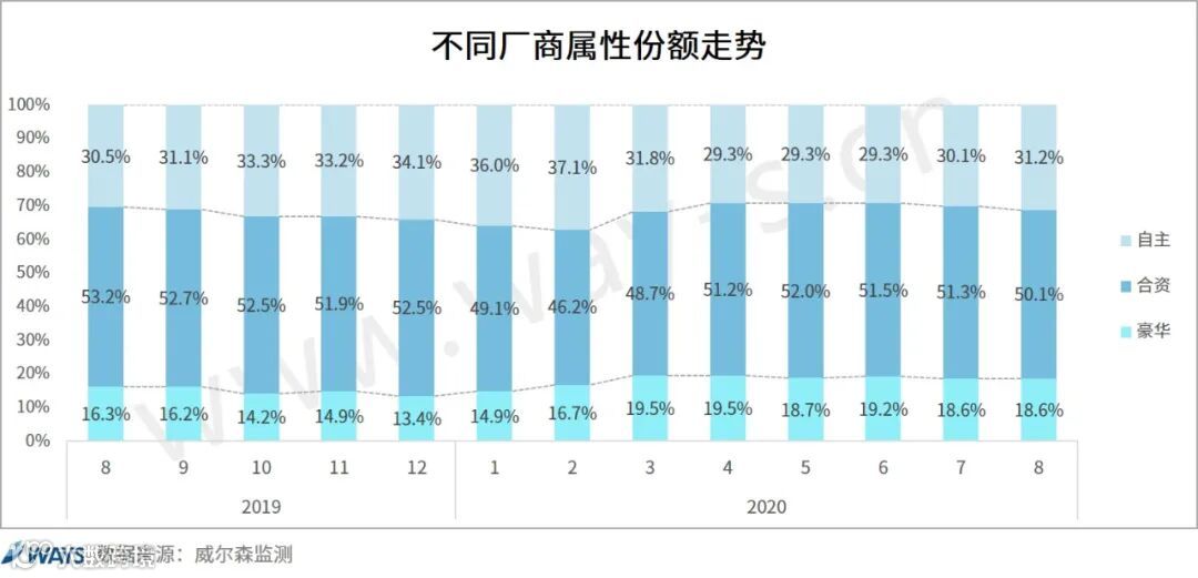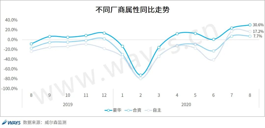 8月豪华品牌份额基本与7月持平,对比去年同期,份额增长2.3%。从同比增速上看,豪华品牌仍是继续领跑,增速达30.6%。在消费升级的高端增换购需求和豪华品牌价格不断下探的刺激下,豪华市场增长持续向好。