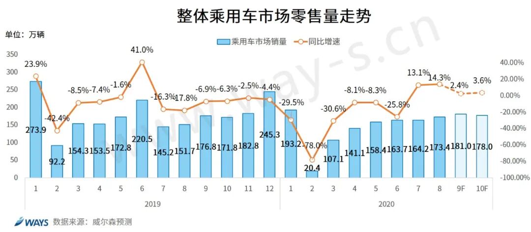 根据威尔森预测,2020年10月乘用车市场预测零售量为178.0万辆,同比上升3.6%,环比下降1.7%。