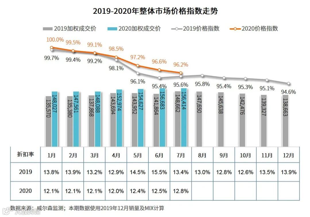 《报告》内容还显示,随着国内疫情影响逐渐消退,汽车市场持续恢复,以及前期受疫情影响抑制的市场需求逐渐释放,降价促销是抢占市场需求重要的途径,价格指数下降趋势明显;2020年7月的整体市场价格指数为96.2%,环比下降0.4%。