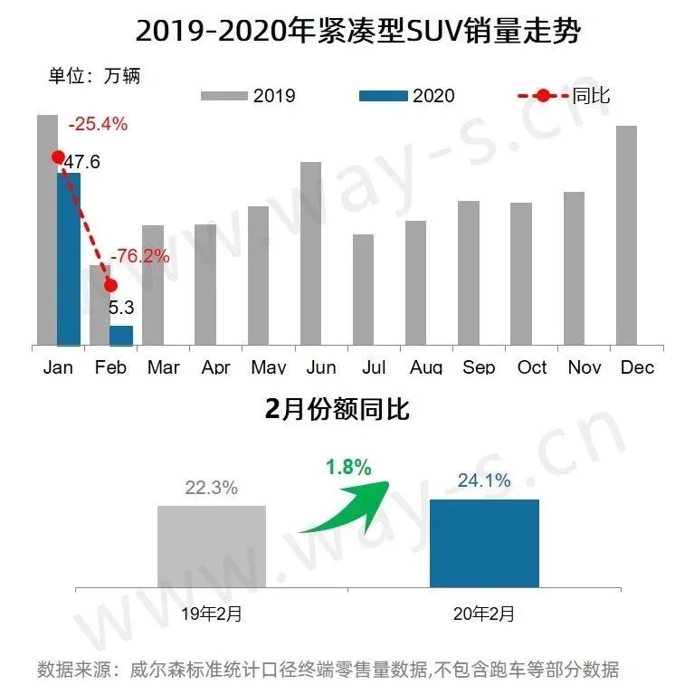 2月紧凑型SUV销量为5.3万辆,同比下降76.2%;份额为24.1%,同比上升1.8%。