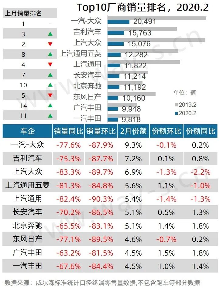 2月TOP10厂商均无一例外全线大幅下跌,且车企的排名均较以往有较大的变化。一汽-大众以2万多辆的销量,守住了冠军位置;吉利汽车2月以微弱的几百辆的优势超过上汽大众,升至亚军位置;而上汽大众、上汽通用五菱与上汽通用这三位来自上汽集团的选手跌幅均超八成,分别排在第三至第五名;北京奔驰已连续第二个月进入前十榜单,且2月排名更有所上升;广汽丰田与一汽丰田同比跌幅在-60%左右,2月纷纷冲进前十榜单。