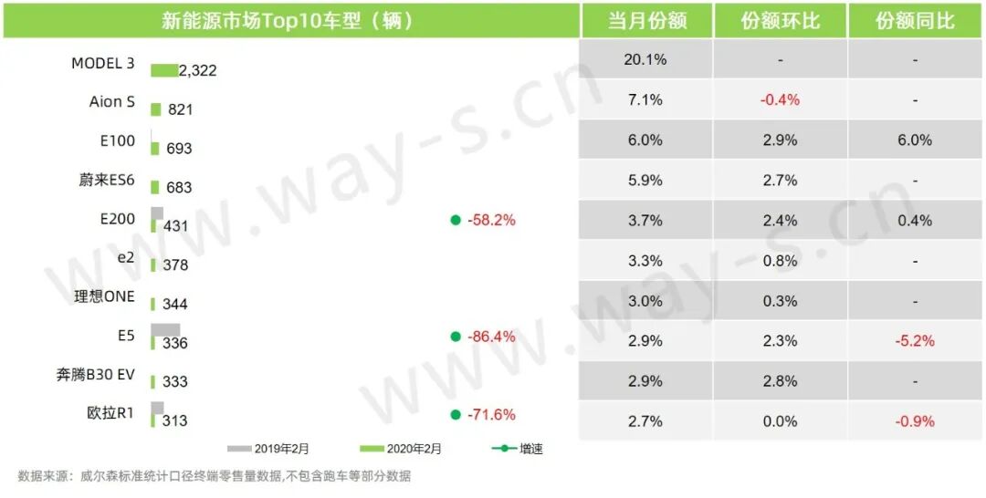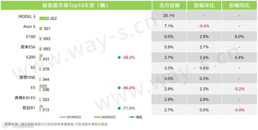2月新能源市场中,国产后的MODEL 3表现出色,上市首月虽遇上疫情,但仍能以2300多辆的销量荣登榜首;E200、e2、E5、奔腾B30 EV等车型冲进榜单前十;而1月榜单冠军EU5的销量惨烈下滑,2月已跌出前十榜单。