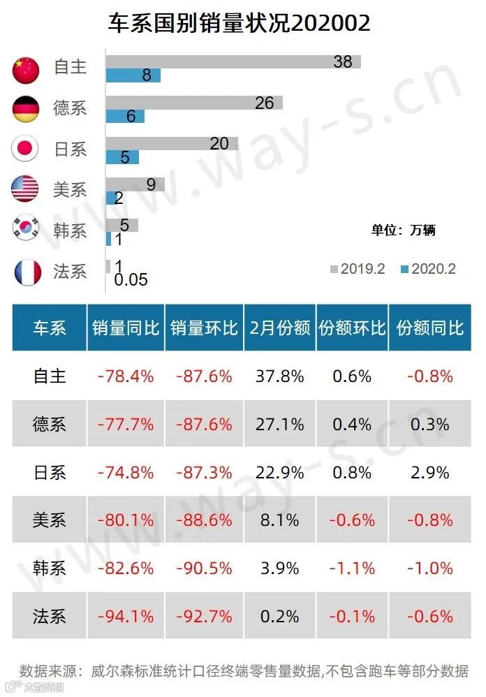 2月整体乘用车市场终端零售量为22万辆,同比下降78.0%,环比下降87.8%。2020年累计销量202万辆,累计同比下滑44.9%。受疫情影响,全国各地经销商无法在春节后如期开门营业,直至2月下旬才开始陆续恢复经营,大部分销售店在线上各平台开展销售活动,但消费者目前购车意愿均较低,且线上销售工作较难转化成交,终端销量到达冰点水平。