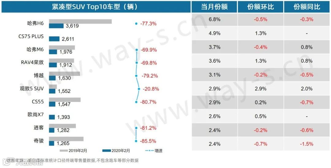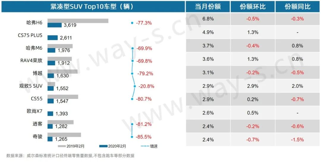 2月紧凑型SUV中,实力强大的哈弗H6虽同比降幅超七成,单月销量跌至3600多辆,但仍无碍其稳坐冠军位置。CS75 PLUS上市后市场表现较好,销量份额持续扩大,2月上升至亚军位置。日产的逍客与奇骏跌幅均超80%,榜单中的排名靠后。