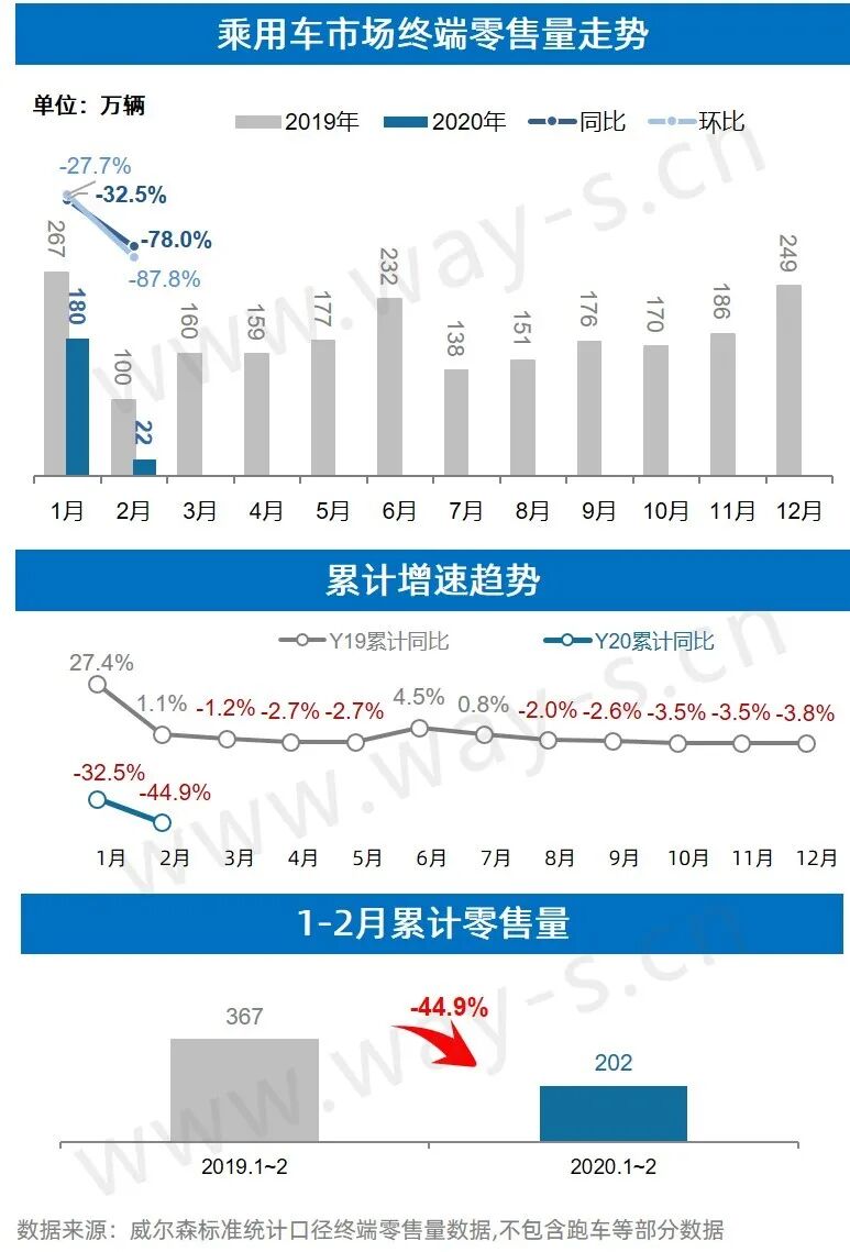 2月整体乘用车市场终端零售量为22万辆,同比下降78.0%,环比下降87.8%。2020年累计销量202万辆,累计同比下滑44.9%。