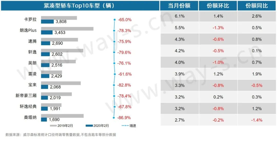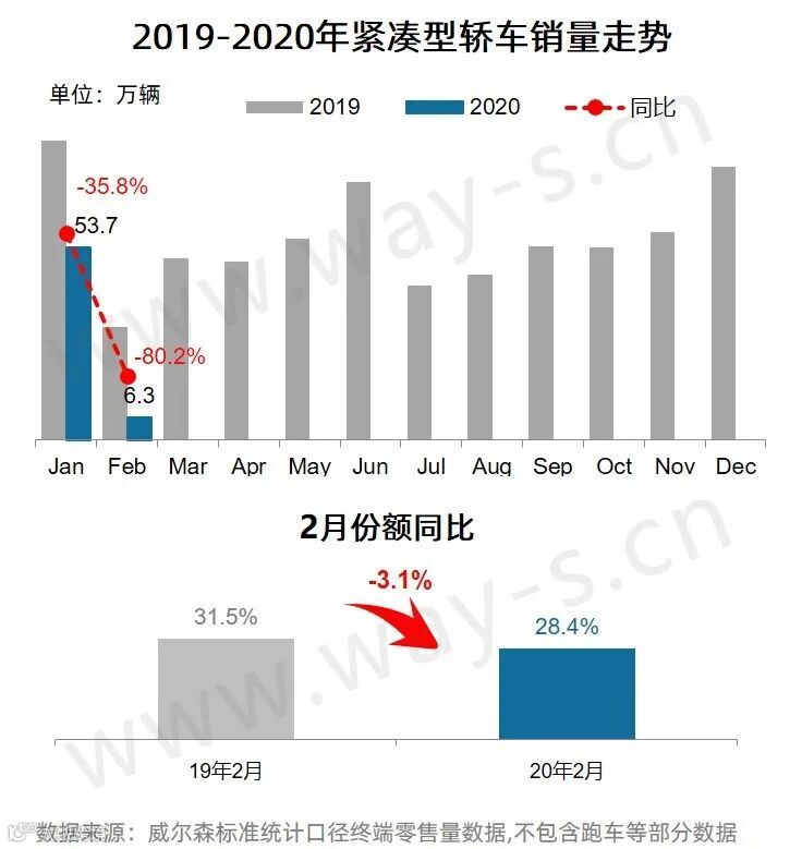 2月紧凑型轿车销量为6.3万辆,同比下降80.2%;份额为28.4%,同比下降3.1%。