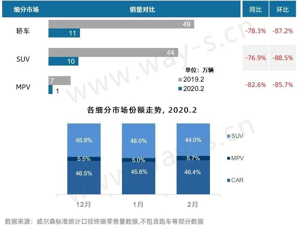 在大市崩盘的情况下,各细分市场情况也基本一致,同比大幅下降。SUV与轿车市场同比降幅超70%,而MPV市场则更为严重,跌幅超八成。