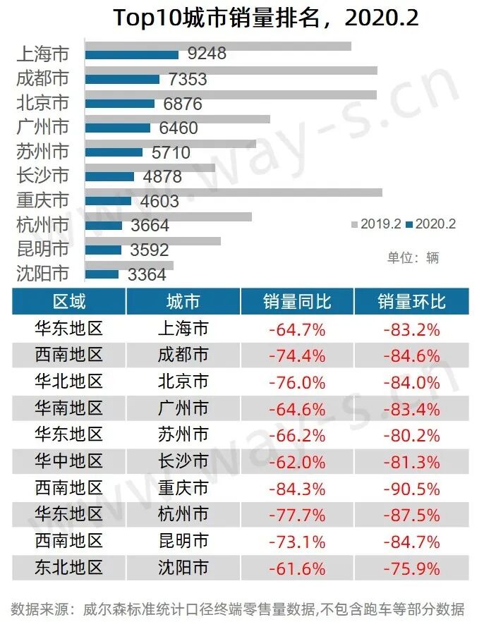 2月TOP10各城市的同比、环比均出现大幅下滑,同比跌幅均超六成,每个城市的销量均不超过一万辆,上海市、成都市与北京市分别排在前三的位置。