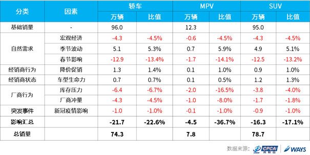 首先,相比2019年11月,轿车市场2020年1月在基础销量上减量22.6%。在春节假期期间,批发基本停止,在此影响下,造成13.4%的减量;市场零售恢复未如预期,经销商库存压力仍较大,导致6.7%的减量;1月厂商批发压力不大,放缓批车节奏,造成4.5%的减量;影响车市消费的经济因素仍未改善,必须消费品价格上涨及楼市对消费资金的持续挤压,宏观经济下行压力加大,造成4.5%的减量。此外,季节性上升,带来5.3%的增量;经销商降价促销,以促动购车,刺激需求增加1.4%。