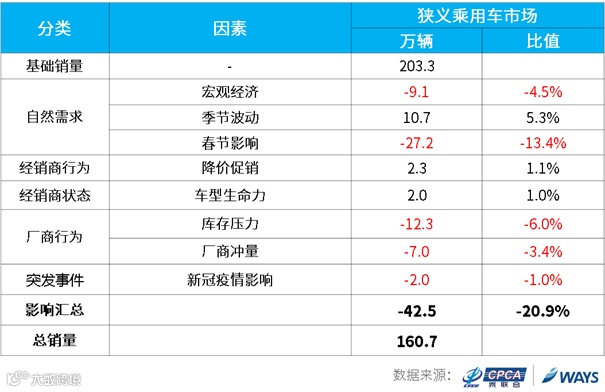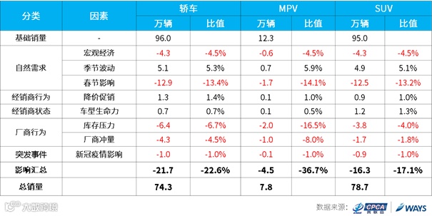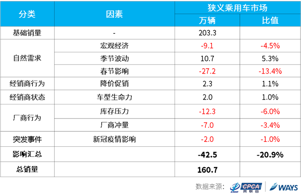 用量化方法将影响批发量的主要因素拆解后可知,影响2020年1月狭义乘用车市场批发量的主要因素包括:春节假期影响、经销商库存压力上升及宏观经济下压造成的减量;此外,季节性上升,带来一定的增量。