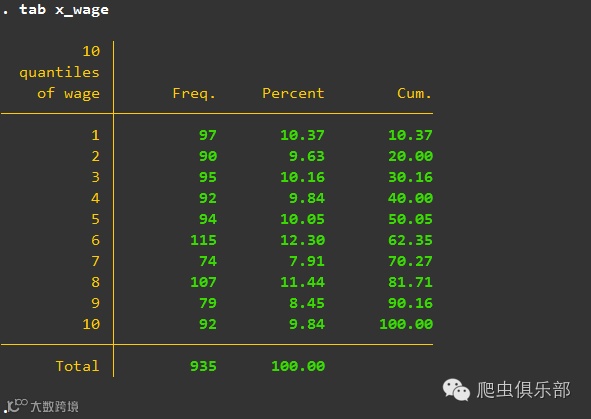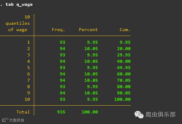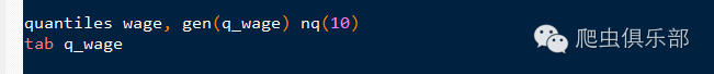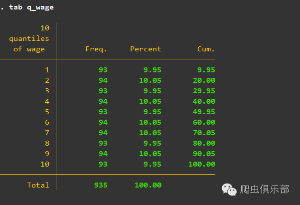 大家可能注意到里面似乎每组的数据量并不相等,这是因为xtile严格按照先确定分位数,然后分组的顺序来处理,这导致某些观测值相等的话会被分到同一组,使得每组数量可能并不相同。极端的例子,假如某个变量中有大量的0值,最终分级的结果可能是第1组的数量比重非常大,这显然不是我们所希望。因此,通常情况下,并不推荐使用官方命令xtile,而是使用第三方命令quantiles,它由Rafael Guerreiro Osorio编写,会将每组观测数自动处理好,延续上述的例子,以下是quantiles命令处理的结果: