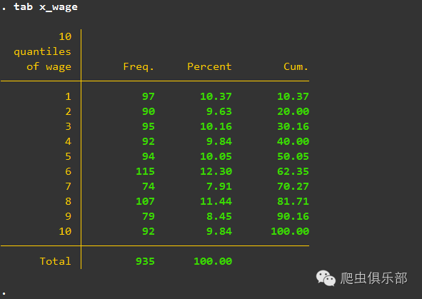 大家在阅读文献的时候,经常会看到作者对变量进行分级处理,如decile(十分级)处理。其基本原理很简单,就是先将变量从小到大排列,然后选取所定的分位数为节点,将整体数据分组,从小到大依次取值。以三分级为例,先将数据从小到大排列,然后分别找到33%分位和67%分位数,然后将小于33%分位数的全部取值为1,33%至67%的取值为2,大于67%的取值为3。我们要进行变量分级处理的时候,可以使用官方xtile命令,以十分级为例(数据为伍德里奇《计量经济学导论》wage2):