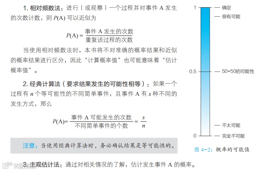 以下是三种计算概率 0 ≤ P(A) ≤ 1 的方法。图 4-2 展示了概率的可能值以及对可能性的描述。