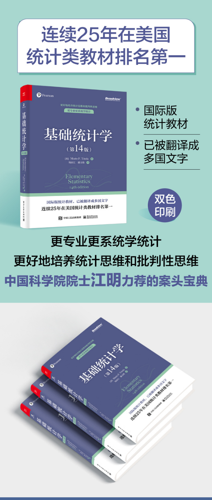 《基础统计学(第14版)(双色)》一书通俗易懂、妙趣横生、案例精彩、数据丰富,且连续25年在美国统计类教材排名第一。书中包括统计学在各个学科领域中的关键应用,不限于自然科学、经济学、法学等,任何专业的学生都能在本书中找到与未来工作相关的实际应用。作者花费数千小时收集的真实数据集,配套200多个案例场景生动讲解知识点应用。希望每一位学习统计学的小伙伴来都拥有这本案头宝典。