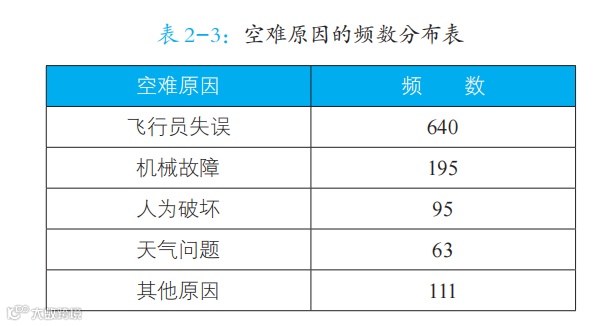 表 2-3 中列出了从 1960 年到最近几年有关空难原因的数据。数据是名目测量尺度下的分类数据,但也可以创建如表 2-3 所示的频数分布表。可以看到,飞行员失误是空难的主要原因。这些信息有助于美国联邦航空管理局(Federal Aviation Administration)等监管机构制定减少此类事故的策略。