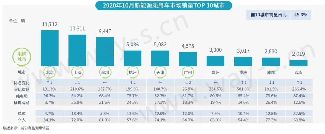 新能源乘用车市场销量TOP 10城市:北京及上海销量破万