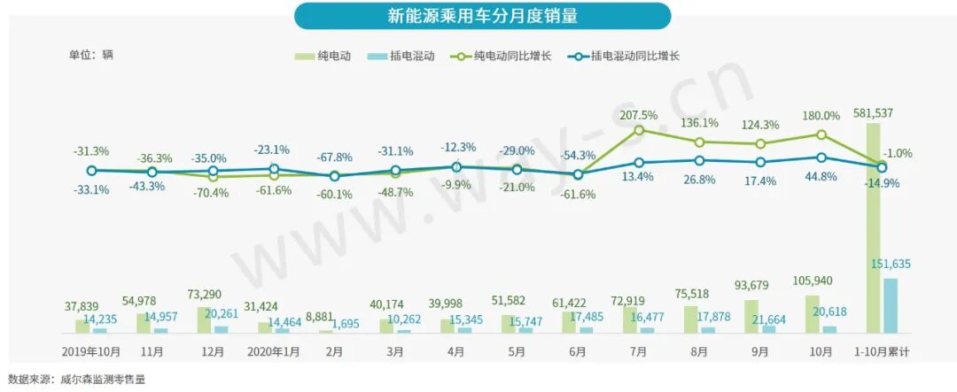10月新能源市场销量约为12.7万辆,环比增长9.7%,同比增长143.0%;2020年1-10月累计销量73.3万辆,累计同比下滑4.2%;10月纯电动销量约10.6万辆,环比增长13.1%;插电混动销量约2.1万辆,环比下滑4.8%。