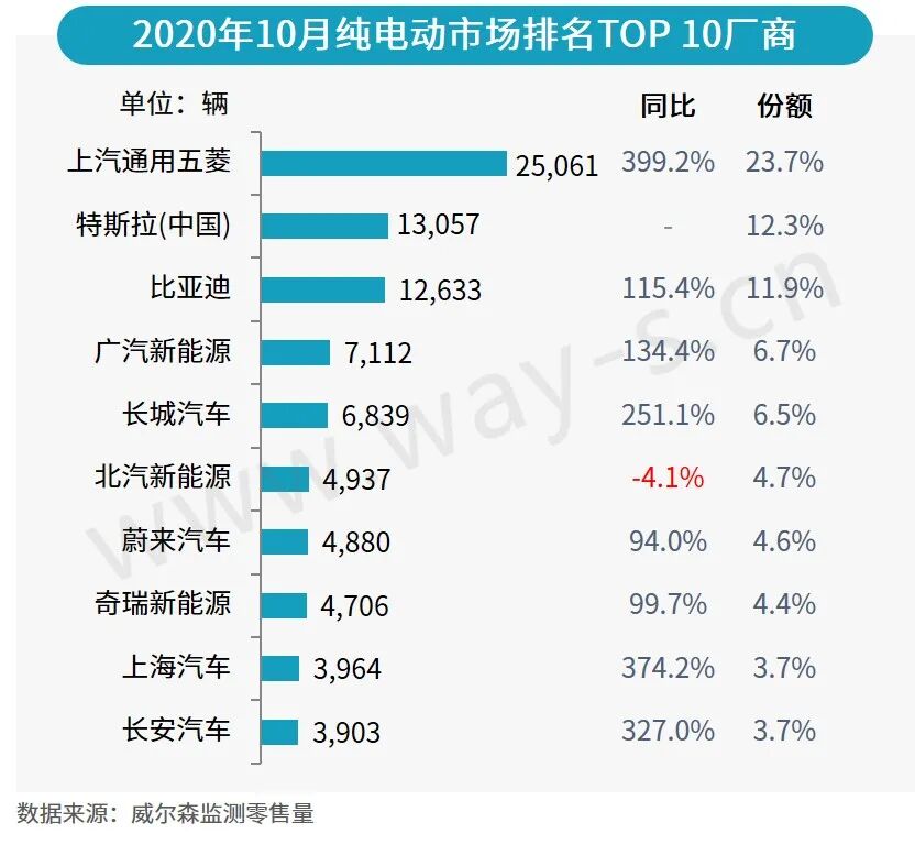 BEV市场-宏光MINI EV 销量破两万 10月,宏光MINI EV销量持续增长,销量破2万,蝉联冠军;上汽通用五菱销量遥遥领先,市场份额快速增长,稳居榜首 |