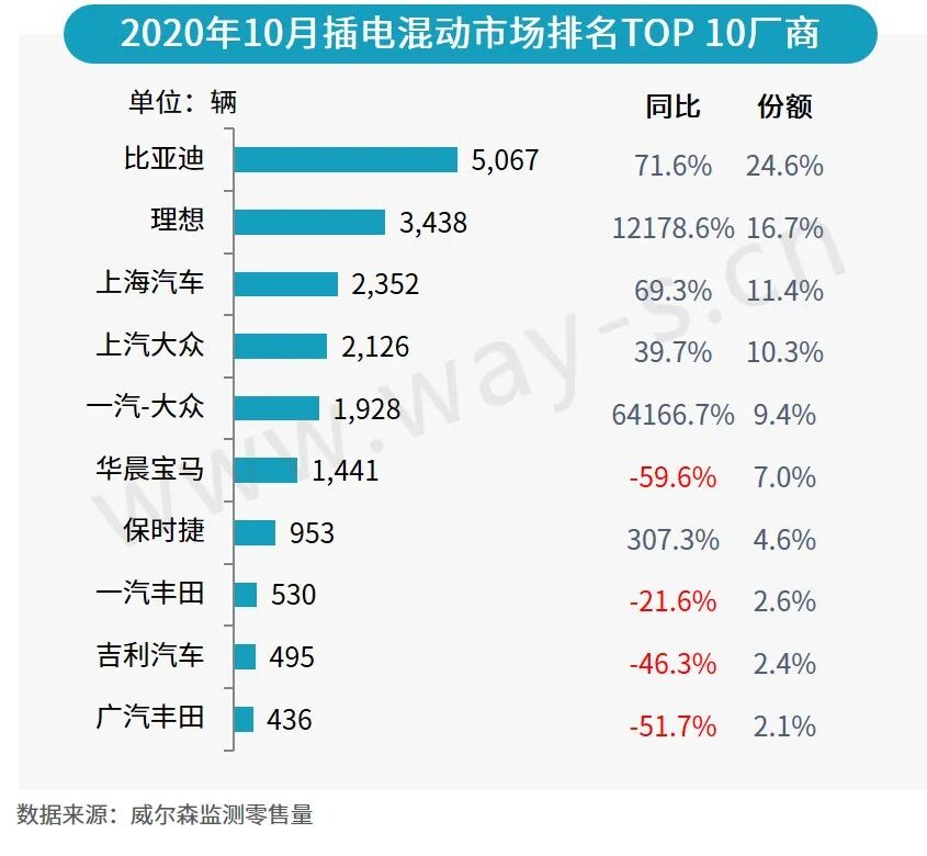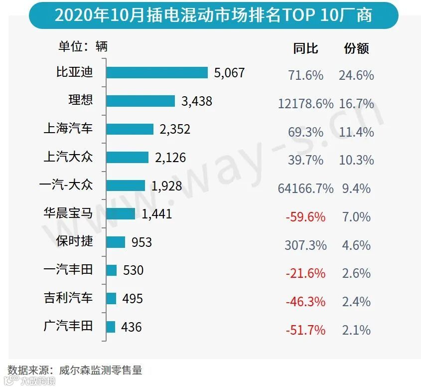 PHEV市场 -理想ONE销量稳居榜首 10月,理想ONE稳居榜首,2020年累计销量破2万辆;唐 PHEV超越5系Le,位居第二,带动比亚迪蝉联厂商销量榜首 |