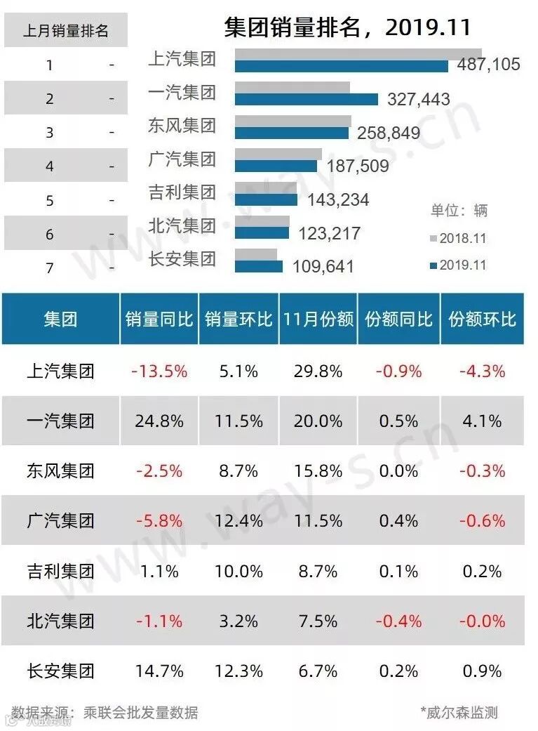 11月七大汽车集团销量,一汽集团、吉利集团和长安集团同比均为正增长,长安集团更是本年度首次单月同比实现正增长。