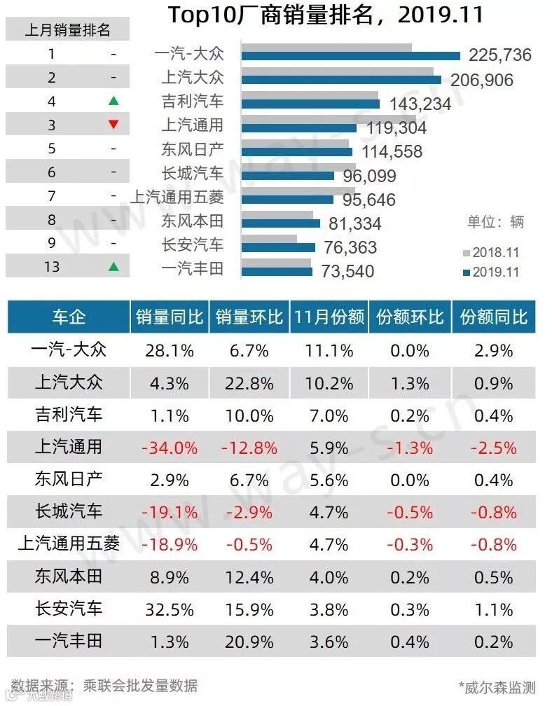 11月TOP10厂商中,一汽-大众销量同比大幅增长28.1%,稳坐冠军宝座,而排名第二的上汽大众也并没停下追赶的步伐,环比增长22.8%,尽力缩小与一汽-大众的差距;吉利汽车凭借多款车型近期集中发力,同、环比均有所增长,超越上汽通用冲进前三的位置;上汽通用销量增长乏力,仍未摆脱大幅下滑情况;而长城汽车虽仍保持10月的排名,但同比出现明显降幅。