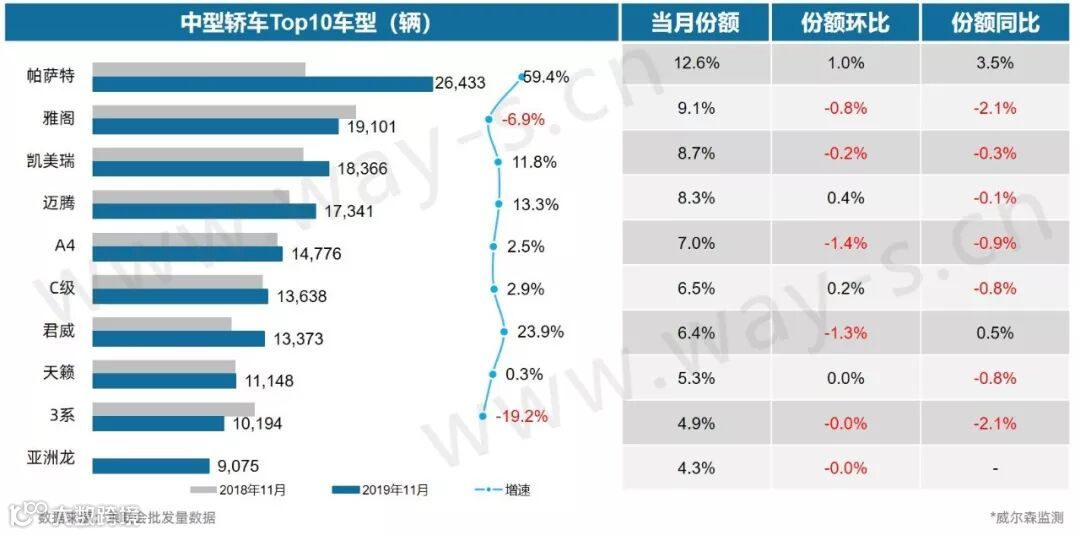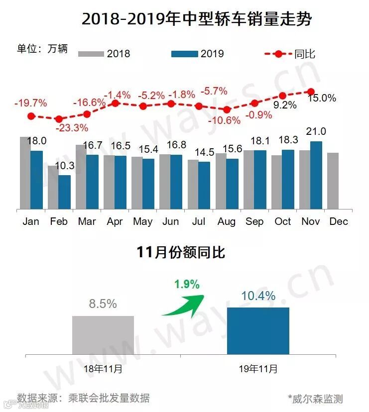 11月中型轿车销量为21.0万辆,同比增长15.0%;份额为10.4%,同比增长1.9%。