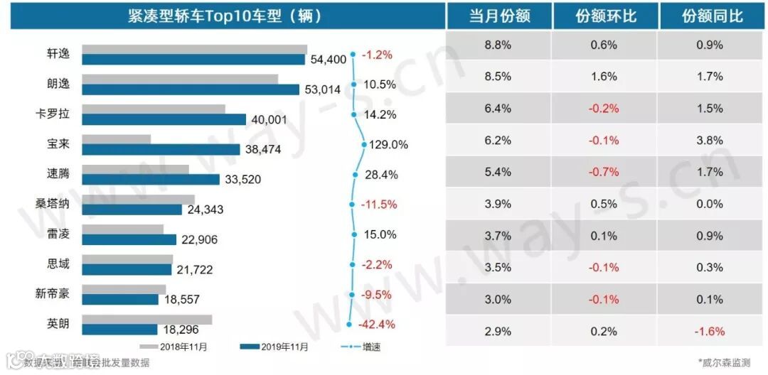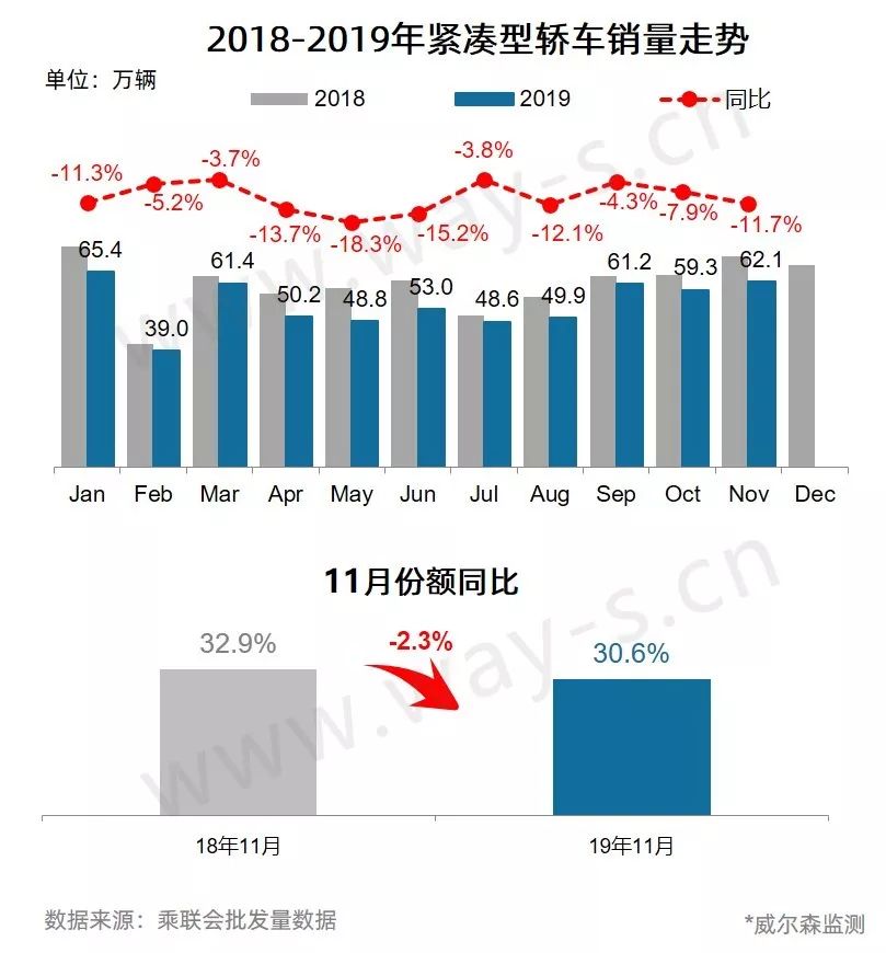 11月紧凑型轿车销量为62.1万辆,同比下降11.7%;份额为30.6%,同比下降2.3%。