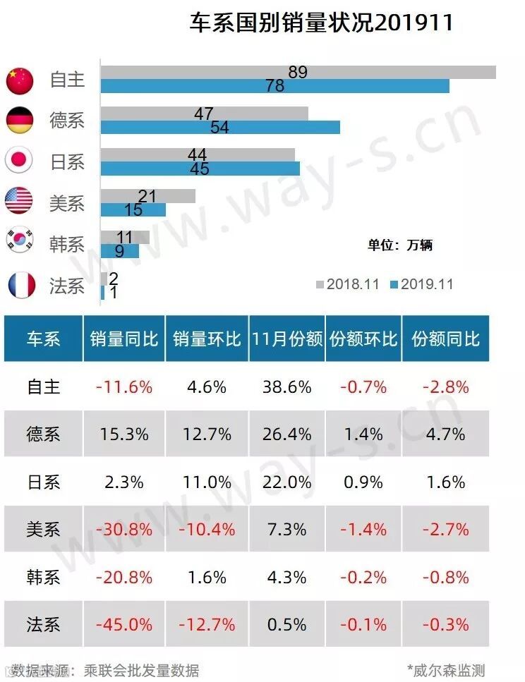 11月仍只有德系与日系保持同比上升,德系后劲十足,越靠近年末,同比增速越大,11月同比增幅达15.3%,远抛离其他系别;日系销量稳中有升,而其他系别的表现均不够理想,自主品牌虽环比继续保持增长,但同比跌幅依然超10%,美系与韩系同比的跌势仍在加剧。