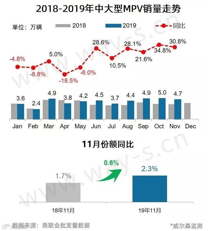 11月中大型MPV销量为4.7万辆,同比上升30.8%;份额为2.3%,同比上升0.6%。