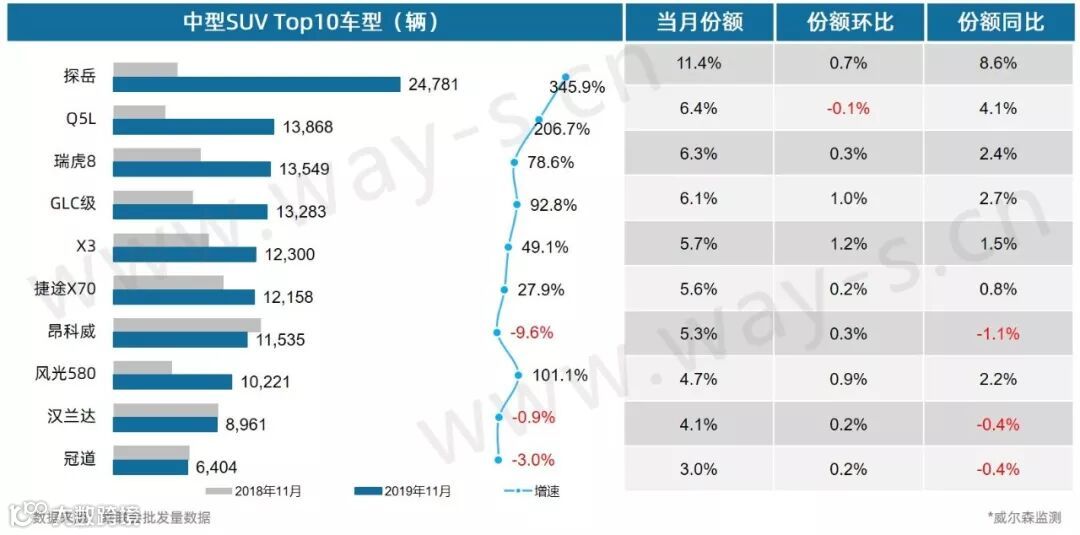 11月中型SUV销量为21.6万辆,同比上升9.3%;份额为10.7%,同比上升1.5%。