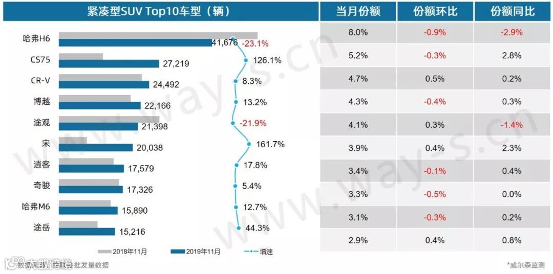 11月紧凑型SUV中,自主车型占据榜单半壁江山;哈弗H6虽同比有明显下降,但无碍其大幅度抛离竞争对手,稳坐冠军位置;CS75销量同比大增126.1%,PLUS车型为其表现增色不少;而博越和宋在PRO车型的加持下也有不错的增幅;途岳销量同比增幅超四成,分流了途观部分的销量。