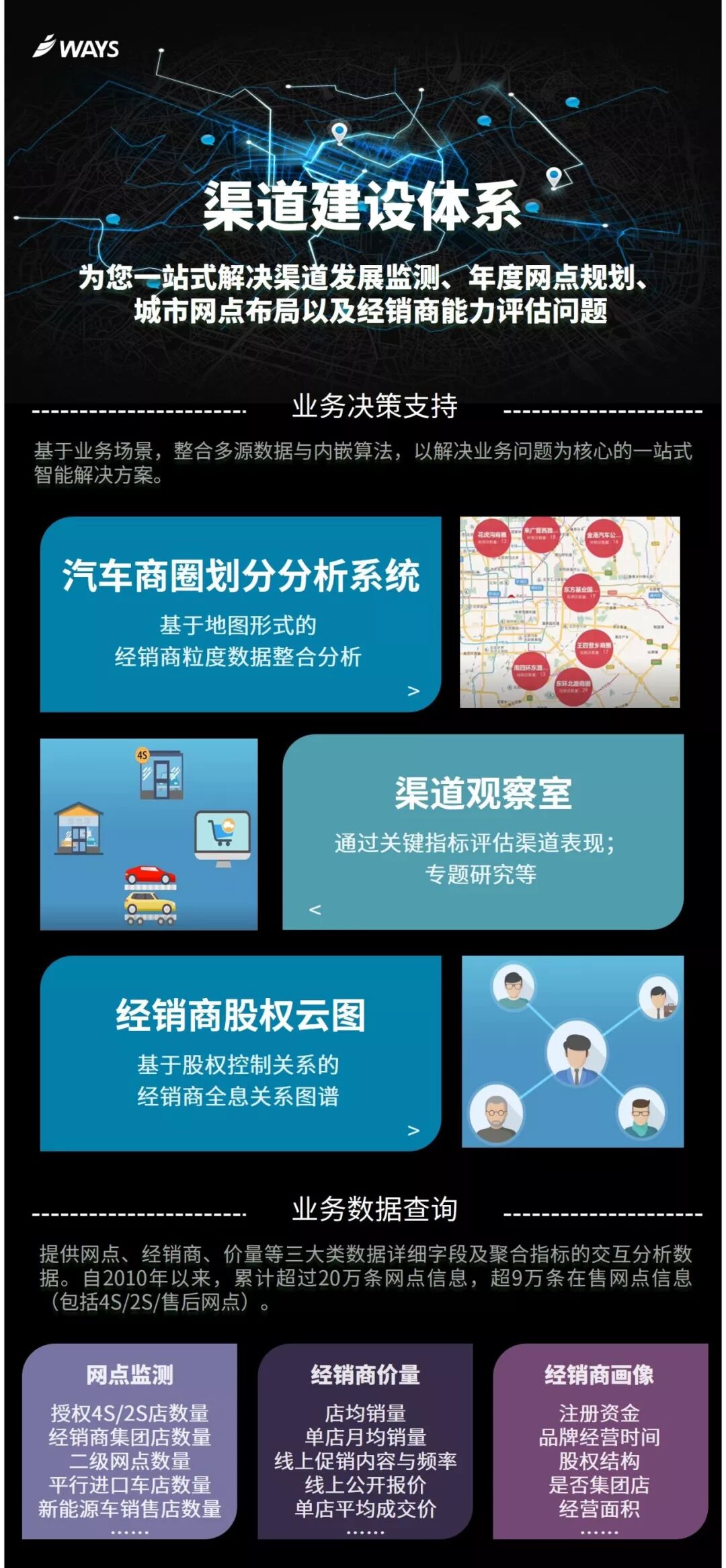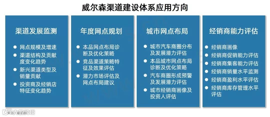 威尔森渠道建设体系,全面追踪监测市场上的经销商网点信息,自2010年以来,累计超过20万条网点信息,超9万条在售网点信息(包括4S/2S/售后网点),为您一站式解决渠道发展监测、年度网点规划、城市网点布局以及经销商能力评估问题。