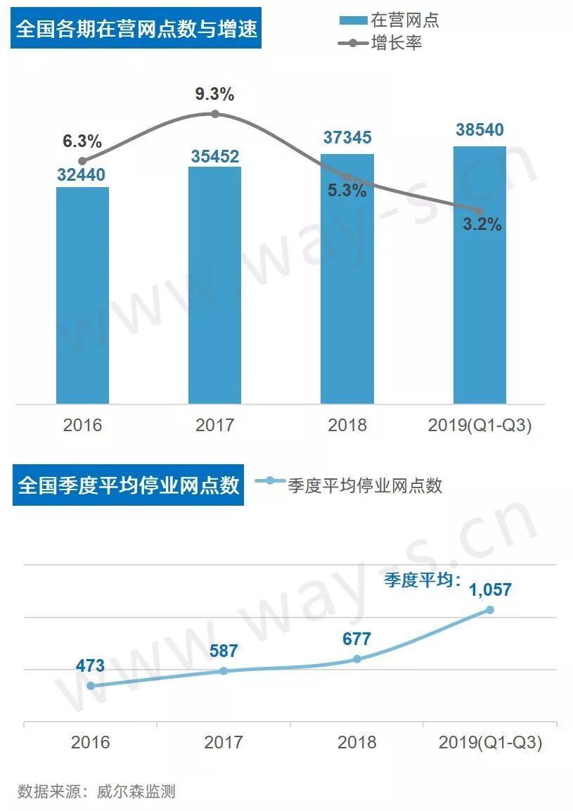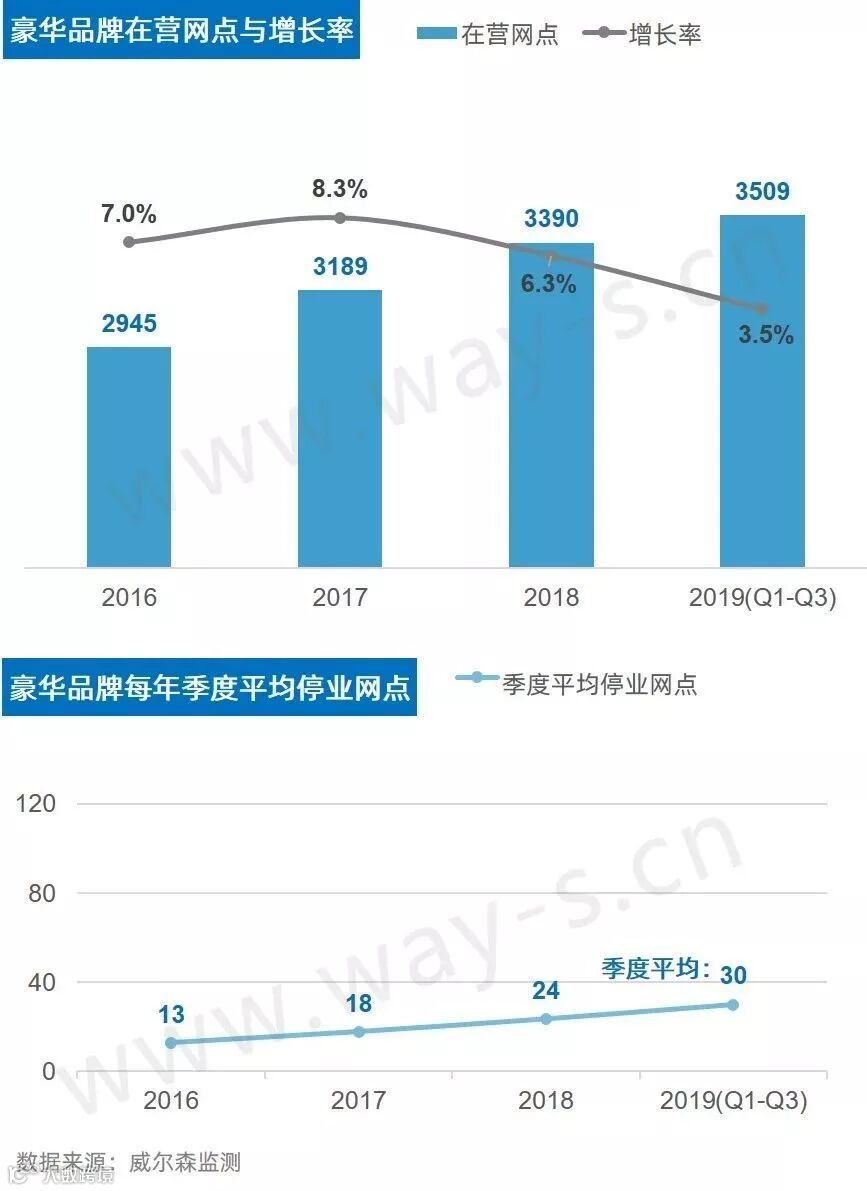 数据结果同样触目惊心,据威尔森渠道数据监测,2019年全国季度平均停业网点数量达到1057家,同比增加56.1%。全国各期在营网点数方面,3.2%的同比增速创下近年来的最低水平。(*文中涉及网点数仅指4S店)