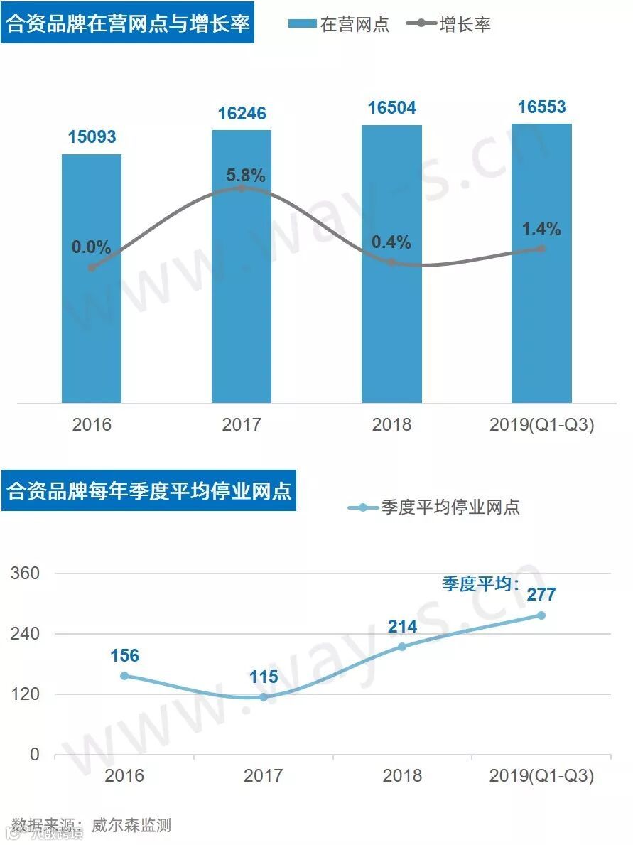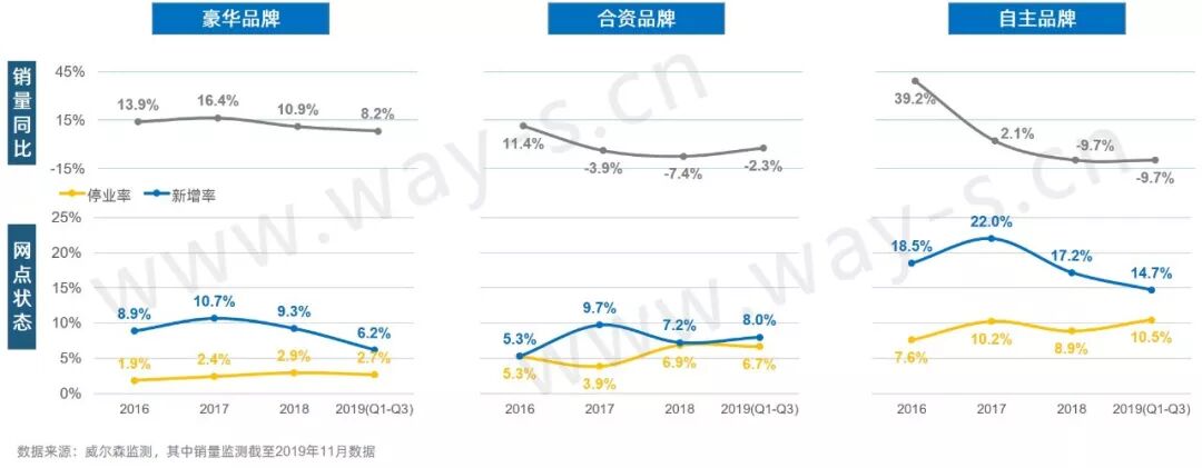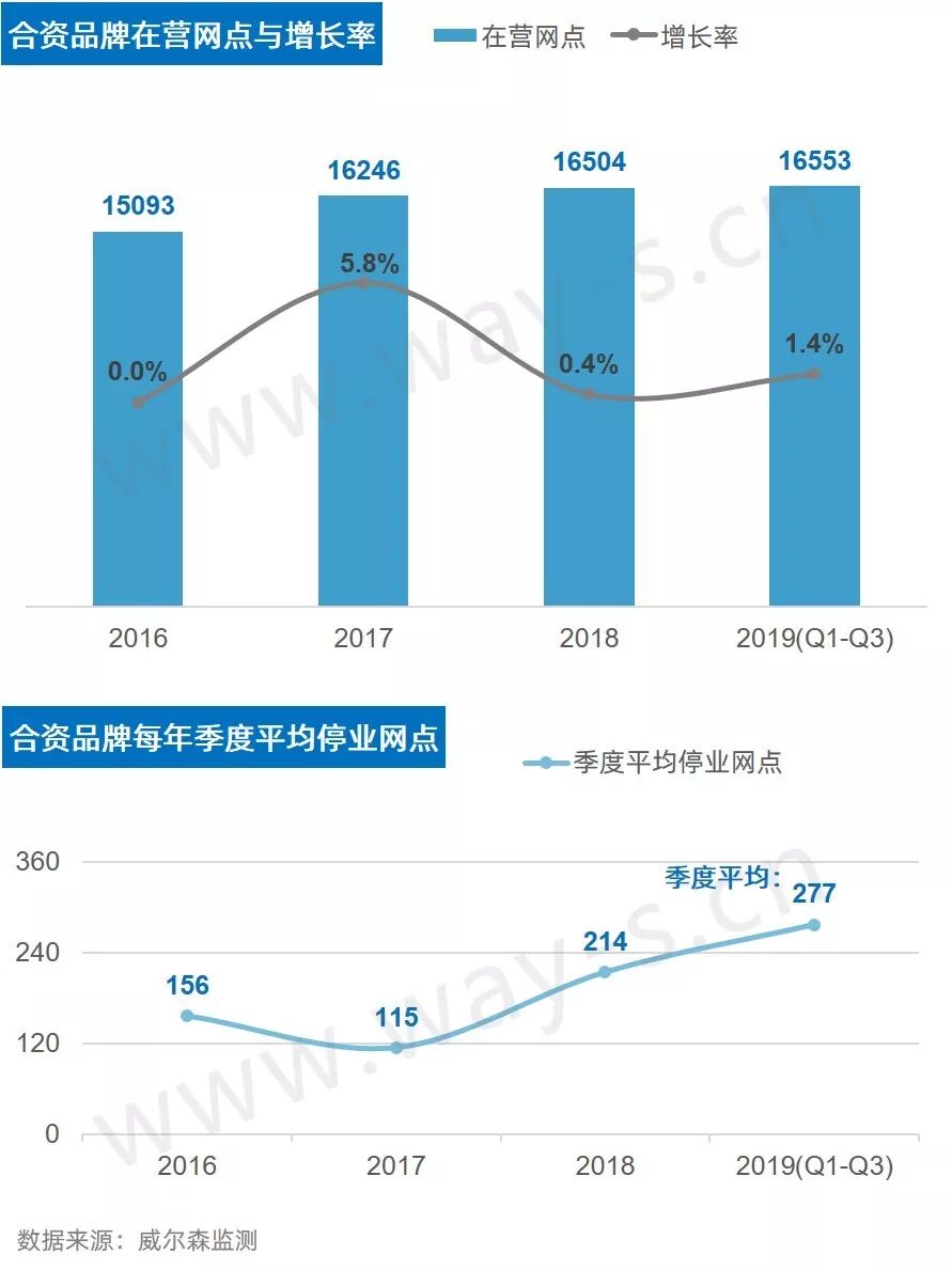 合资品牌:2019年合资品牌的销量与去年基本持平,经销店网点数量方面也相对稳定,2018年停业率大幅上升的状况不再出现。