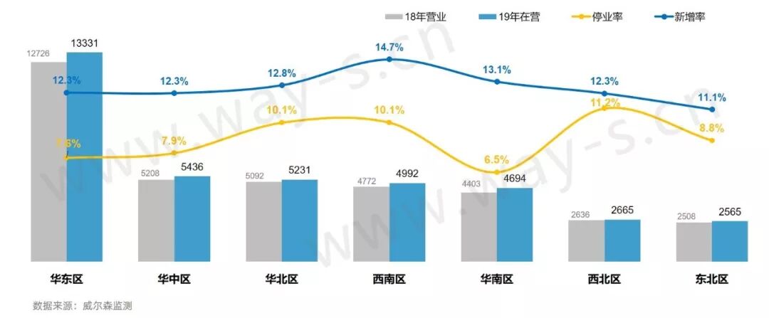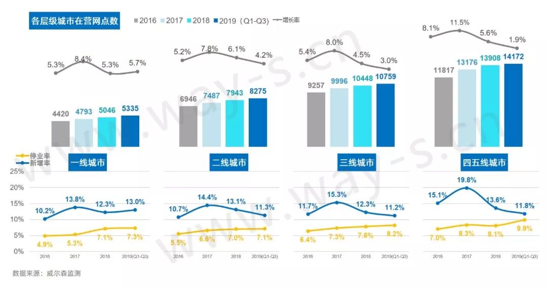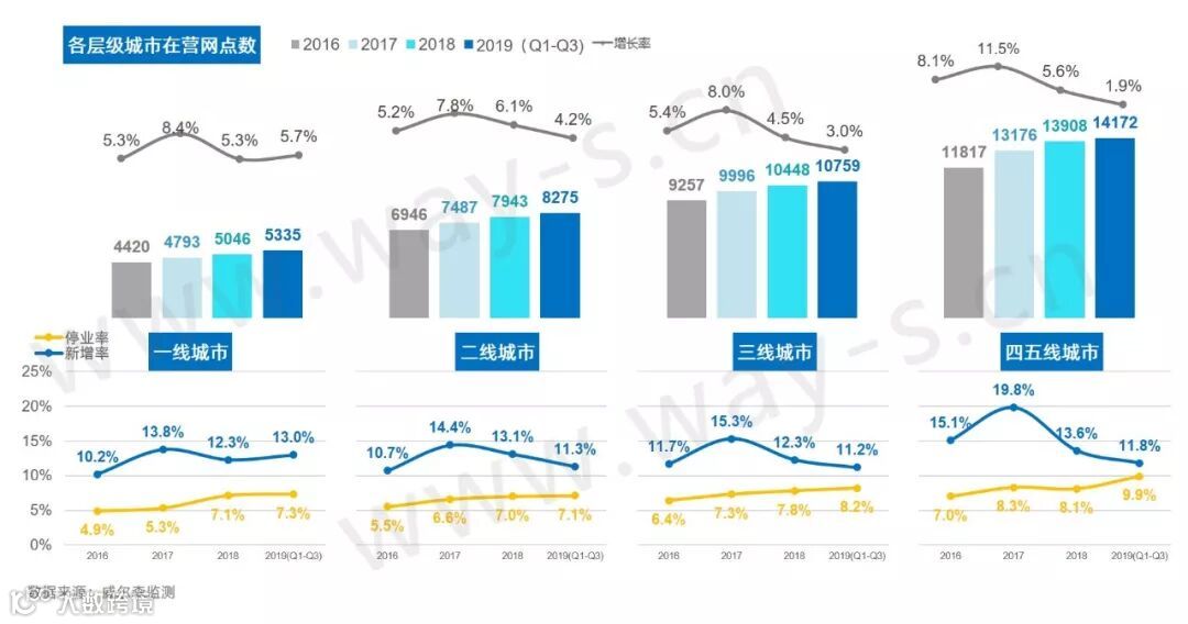 从城市层级的数据来看,先前在渠道下沉风潮中快速成长的三四五线城市显露出疲态,2019年的网点增速降至1.9%,名列各级城市中的最低位,停业率则上升至最高的9.9%;