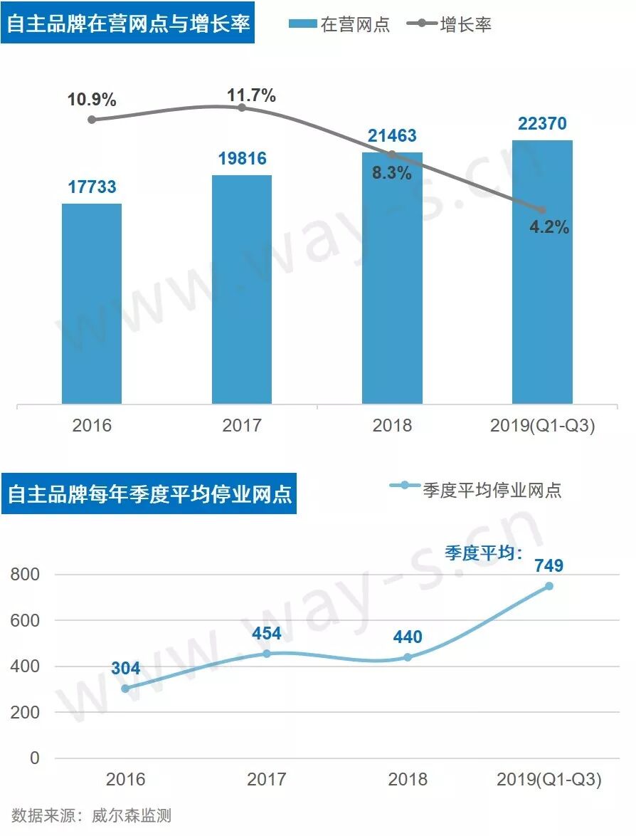 自主品牌目前的在营网点规模达22370家,其中季度平均停业网点数在今年大幅增长至749家,自主品牌经销商们已正式进入了行业洗牌期。