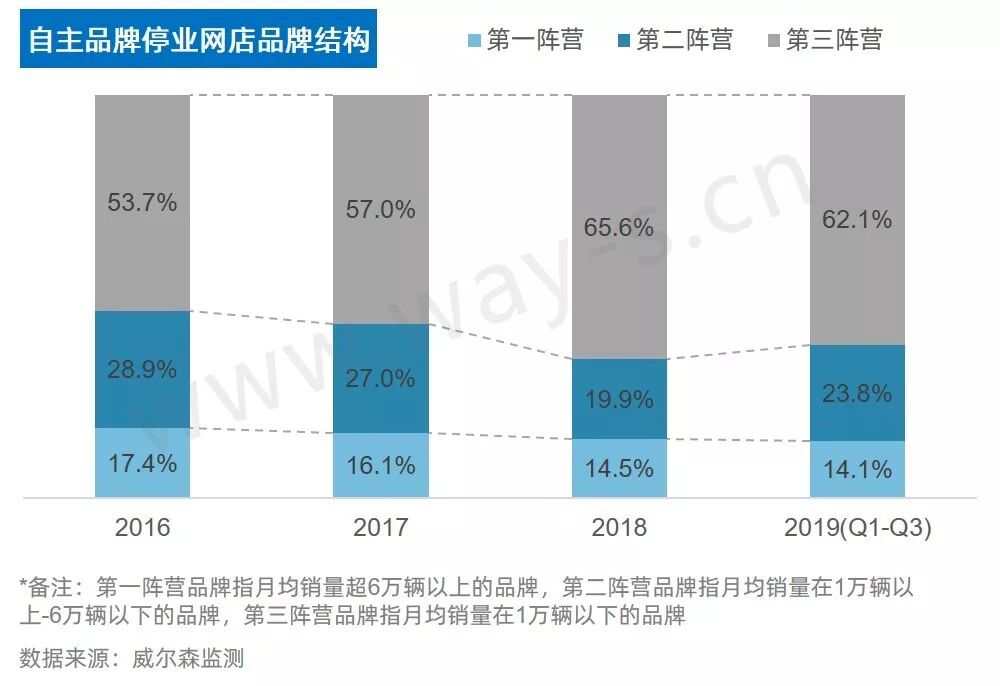 从品牌结构来看,自2018年以来,超60%的停业网点均是来自第三阵营的自主品牌,可以看出在这场残酷的淘汰赛中,销量规模较少的弱势品牌已经受到强烈冲击。