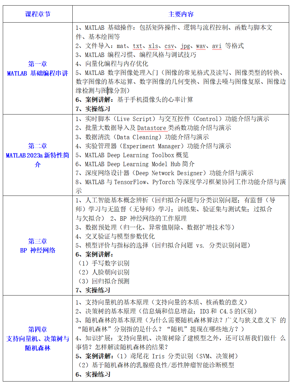 MATLAB是由美国MathWorks公司推出的一款应用于科学计算和工程仿真的交互式编程软件,它有包罗万象的工具箱和草稿纸式的编程语言,将符号计算、数值分析、矩阵计算、科学数据可视化、数据处理与机器学习、图像处理、信号处理、计算金融学、计算生物学以及非线性动态系统的建模和仿真等诸多强大功能集成在一个易于使用的视窗环境中,为科学研究、工程设计以及必须进行有效数值计算的众多科学领域提供了一种全面的解决方案。伴随着人工智能第三次浪潮的兴起与发展,以卷积神经网络为代表的深度学习算法在各行各业都取得了广泛、成功的应用。因此,中国智慧工程研究会联合中科软研(北京)科学技术中心(http://www.fzby.org.cn/)特邀请清华大学教授共同举办“MATLAB数据分析、机器学习与深度学习实践应用”培训班,旨在帮助学员掌握人工智能领域经典机器学习算法(BP神经网络、支持向量机、决策树、随机森林、变量降维与特征选择、群优化算法等)和热门深度学习方法(卷积神经网络、迁移学习、RNN与LSTM神经网络、生成式对抗网络、YOLO目标检测、U-Net图像分割、自编码器等)的基本原理及MATLAB编程实现方法。本次培训采用“理论讲解+案例实战+动手实操+讨论互动”相结合的方式,抽丝剥茧、深入浅出讲解MATLAB2023a深度学习工具箱的新特性,以及经典人工智能方法在实际应用时需要掌握的经验及技巧。具体事宜如下:
