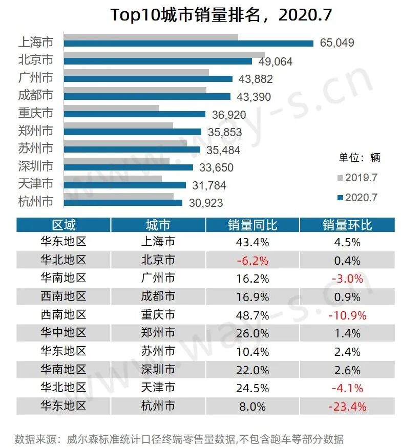 7月TOP10城市中,除北京市小幅下降6.2%以外,其余城市销量同比均有所增长;其中上海市和重庆市同比增幅超40%。