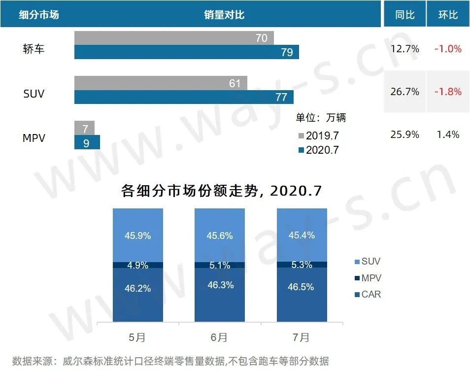 7月各细分市场销量均止跌回升:SUV市场依旧高速领跑,同比增长26.7%;同时MPV市场也一改以往颓势,同比增长25.9%,且环比6月增长1.4%;体量最大的轿车市场也有不错增幅,同比增长12.7%。