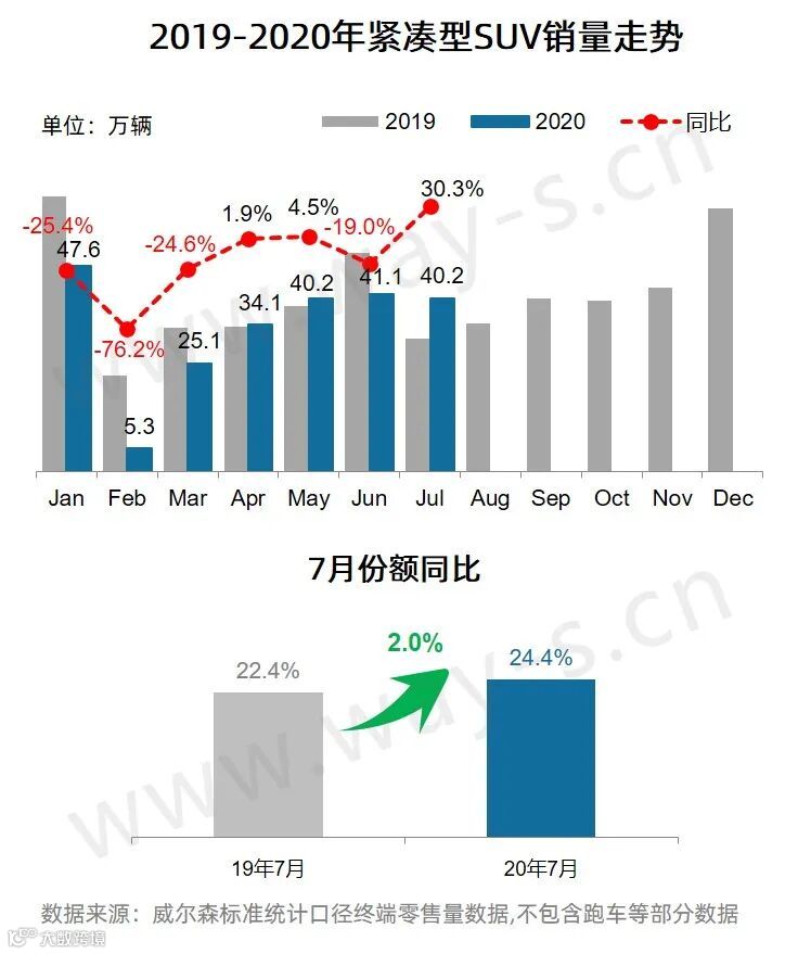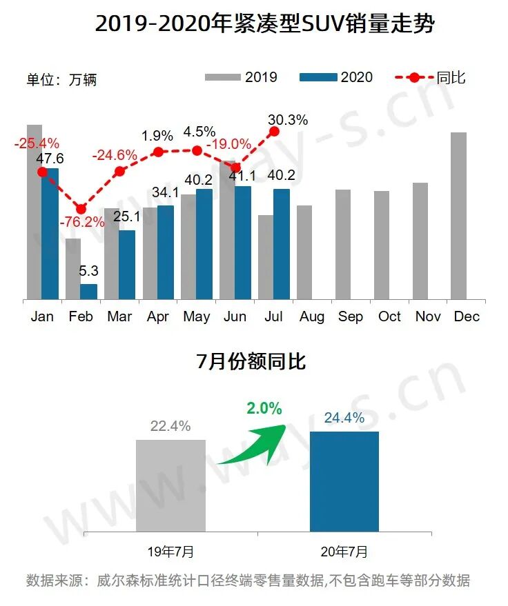 7月紧凑型SUV销量为40.2万辆,同比增长30.3%;份额为24.4%,同比上升2.0%。