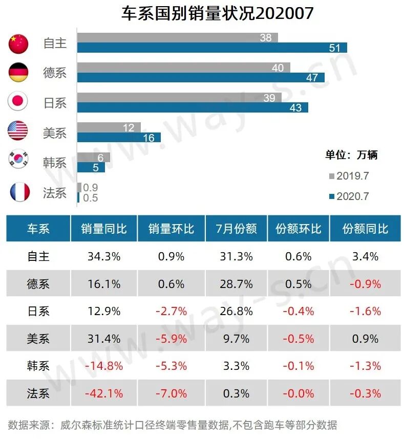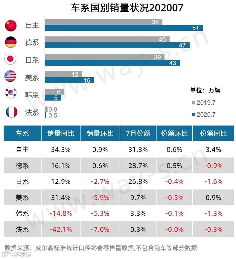 7月,自主品牌同比大幅增长34.3%,增速远超德系和日系两位“尖子生” ;美系得益于别克、福特等品牌的销量回暖,同比增长31.4%;德系和日系品牌稳定发挥,销量同比增幅均在15%左右;而韩系和法系,虽销量同比缺口较6月收窄,但依旧不容乐观。