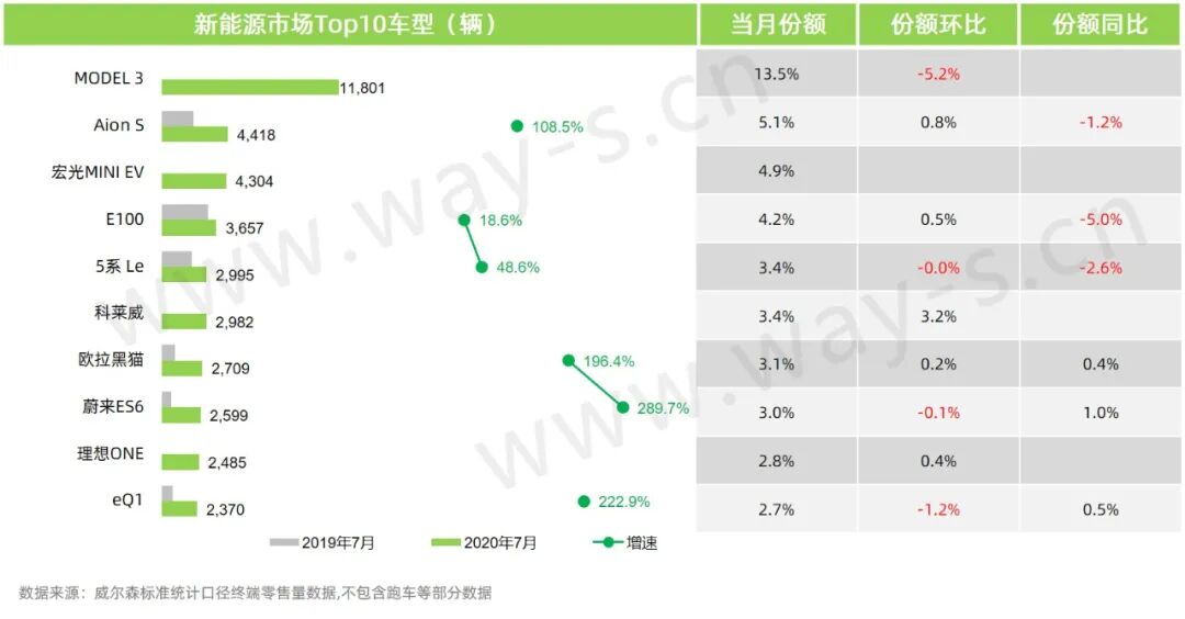 新能源市场中,大部分畅销车型均有不错增幅;MODEL 3销量保持在万台以上稳居榜首位置;宏光MINI EV于7月首次上市销售,销量达到4304台,跻身榜单第三,表现突出;科莱威也为今年上市新车型,首次登上榜单。