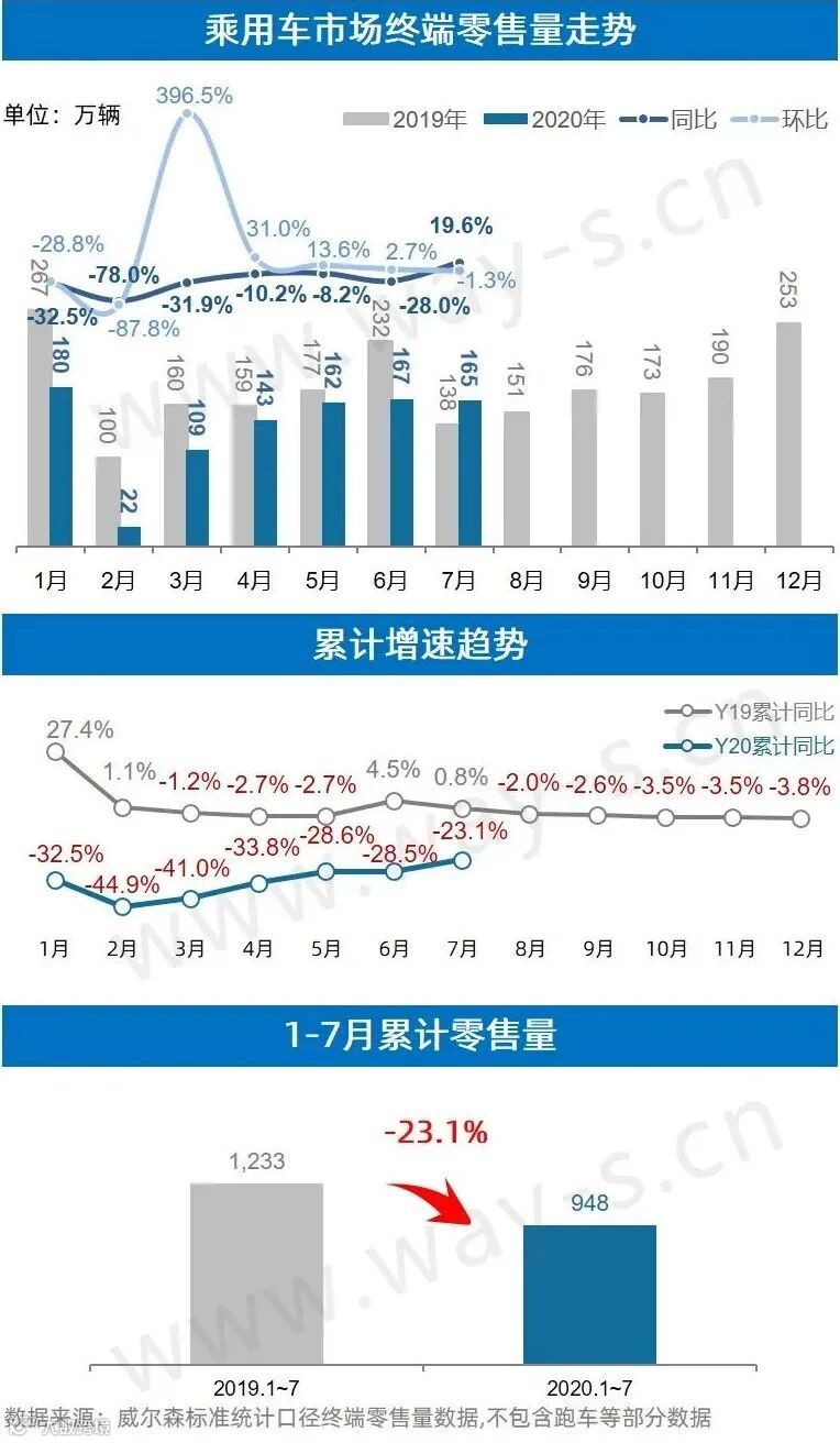 7月整体乘用车市场终端零售量为165万辆,同比增长19.6%,环比下降1.3%;2020年1-7月累计销量948万辆,累计同比下滑23.1%。