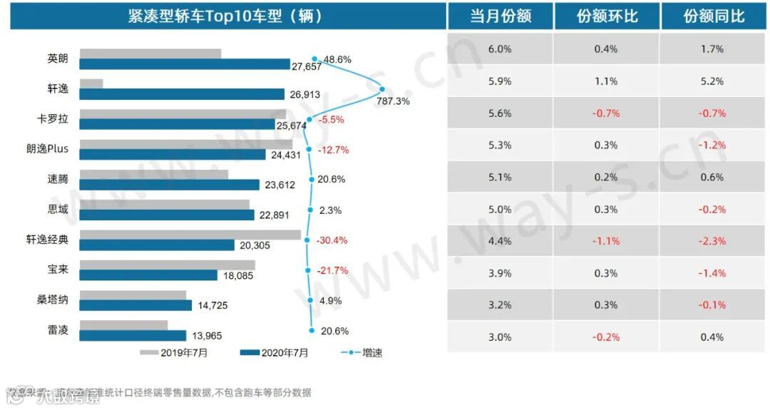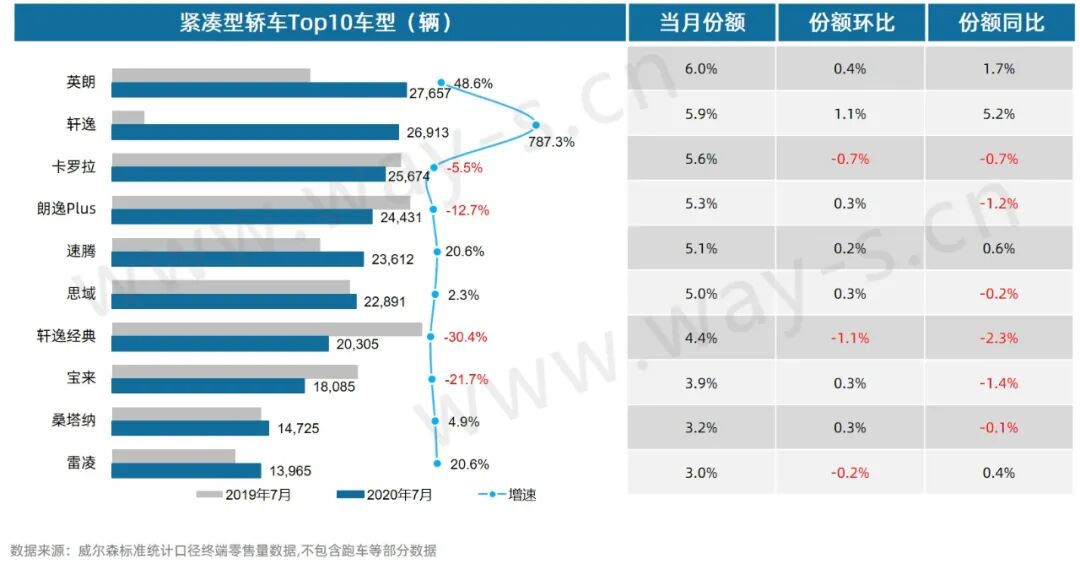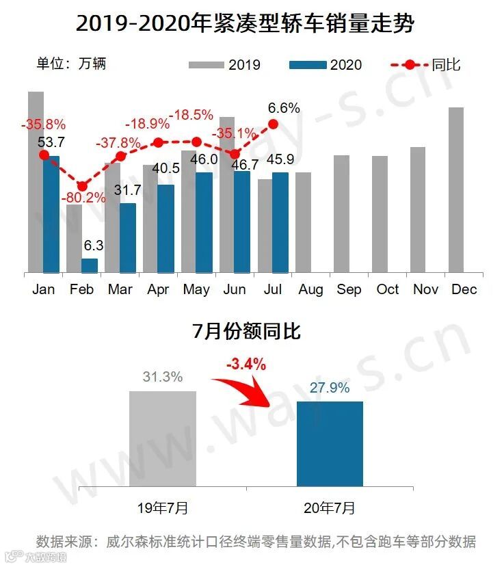 7月紧凑型轿车销量为45.9万辆,同比增长6.6%;份额为27.9%,同比下降3.4%。