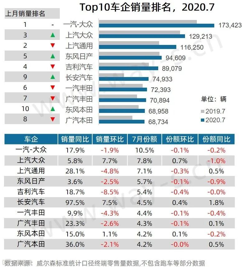 7月TOP10车企中,榜单所有车企出现了全线齐增长局面:一汽-大众同比增长17.9%稳居第一;上汽大众和上汽通用也止跌回升,其中上汽通用增幅近三成,其别克品牌销量回暖贡献最大;吉利汽车同比增长近两成;长安汽车销量增长后劲十足,同比增幅达97.5%,排名较6月提升至第六位,紧跟吉利汽车;广汽丰田和广汽本田销量表现亮眼,同比增幅均超20%。