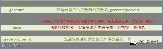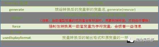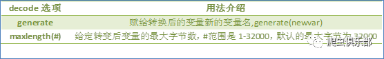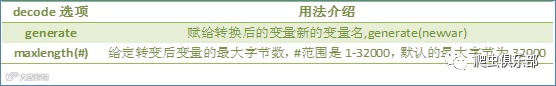 decode命令可以将数值型变量转化为字符型变量,常用选项介绍如下: