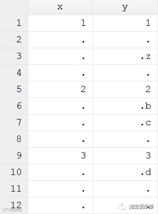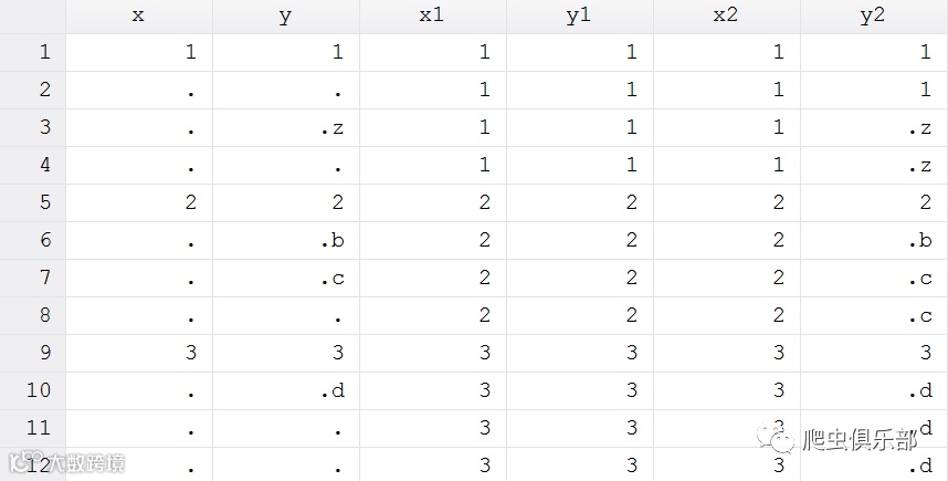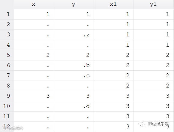 变量x中缺失值的类型只有sysmiss(.),而变量y中缺失值的类型既有sysmiss(.),又有extended missing values。现在使用carryforward命令对两个x、y进行填充缺失值。