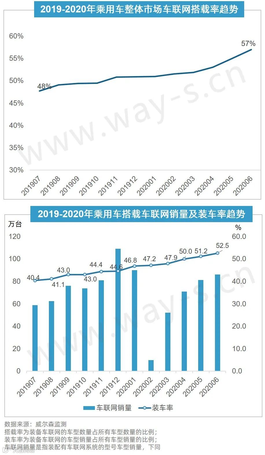 从搭载率来看,2019年7月至2020年6月,车联网搭载率逐月攀升,2020年第二季度车联网搭载率增长明显,截至2020年6月,近60%的车型搭载了车联网。
