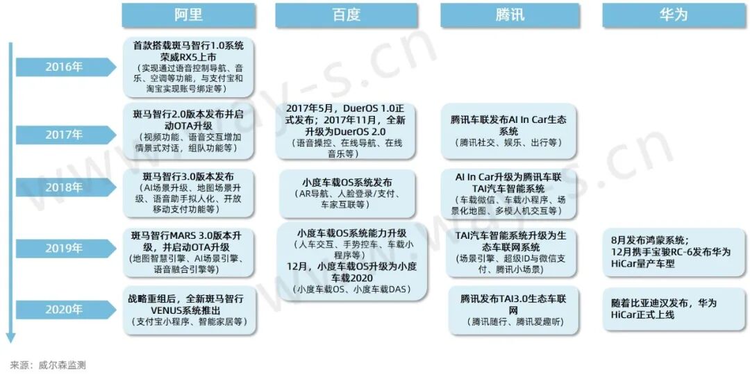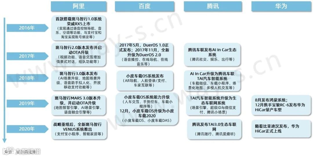 阿里起步最早,基本上每年车载系统都有升级;百度和腾讯晚一年布局,腾讯车联网主要以接入车联网生态为主;华为暂时还没有车载操作系统,以Hicar上车切入。
